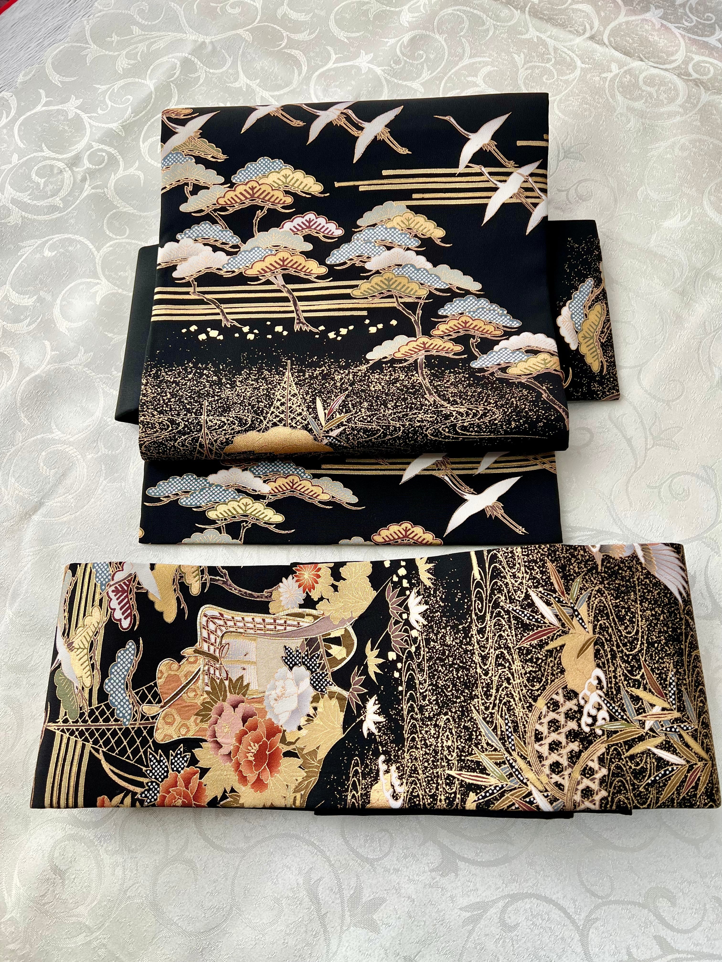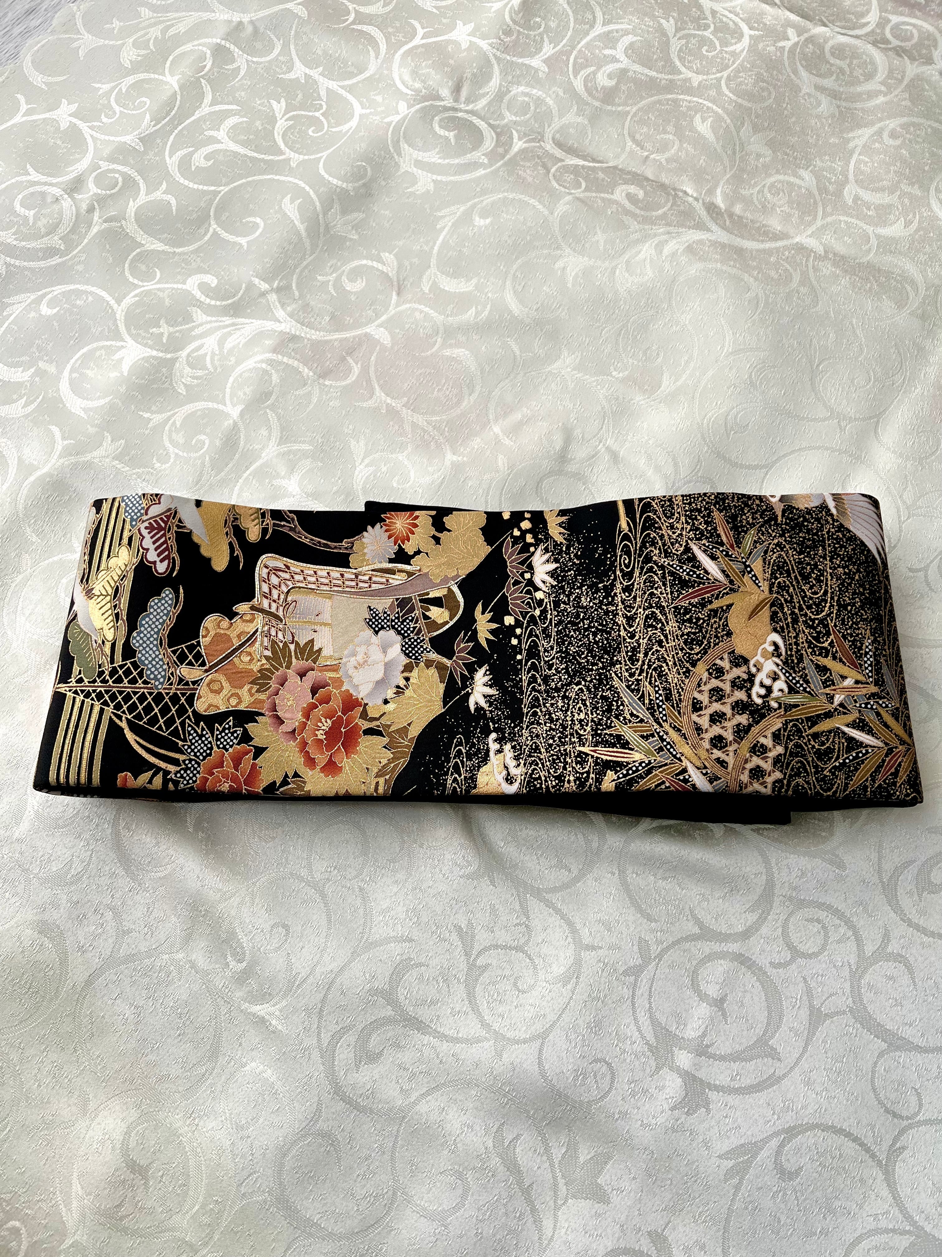 黒地に正統派古典柄を施し、胴部分には金駒刺繍、お太鼓部分はご自身で調整可能、とても装着し易い帯です。